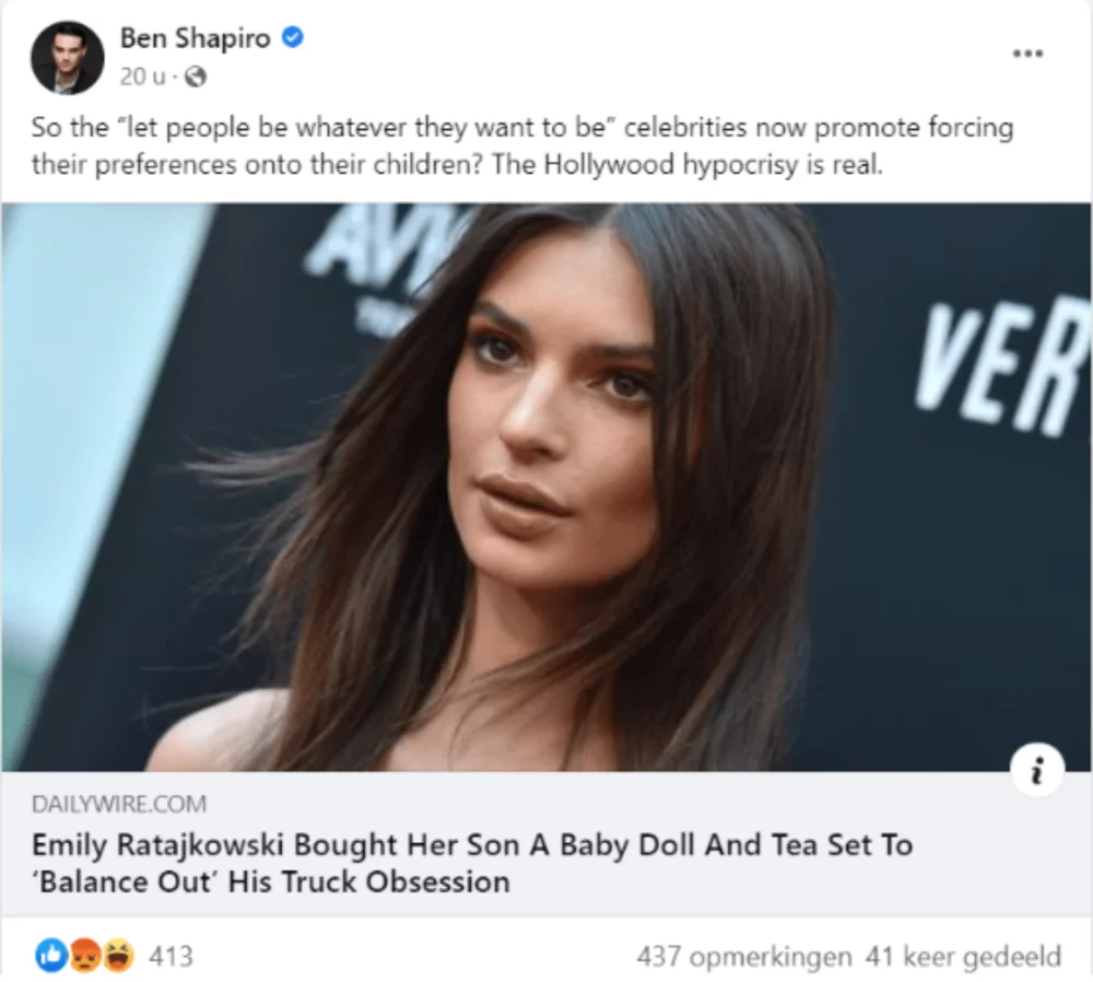 It is notable that he does not fully utilize the affordances Facebook offers to engage with an audience. For instance, he does not engage by responding to questions or engaging in debates and discussions (Jensen & Dyrby, 2013). One of the examples where he does post a link with a short explanation is the post about Emily Ratajkowski and her son. She buys her son a baby doll and a tea set, which clashes with Shapiro’s ideology (see figure 1). However, his facilitation starts and stops with that short explanation. There has been no further interaction from Ben Shapiro with the audience of this post.