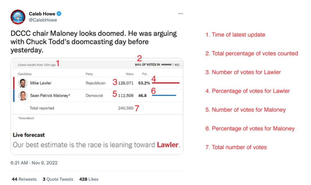 @CalebHowe. (2022, November 9). DCCC chair Maloney looks doomed. He was arguing with Chuck Todd’s doomcasting day before yesterday. Twitter.