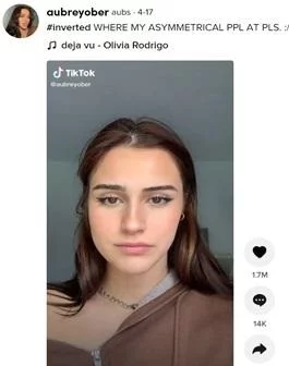 Like Charli, TikToker @aubreyober used the hashtag #inverted, the Déjà Vu sound for her video to fully participate in the trend (figure 2). Since her version was posted five days later than Charli’s video, Aubrey is likely to have seen the trend come on her For You Page from TikTokers like Charli D’Amelio who have symmetrical faces. As shown in figure 2, she does not have a verified account (no tick after her username). This indicates that Aubrey is not a professional or paid TikToker, like Charli. While now she has more than half a million followers, she did not have many followers before this video, but thanks to the TikTok algorithm and the popularity of the trend, her video received much visibility, either by showing up on users’ FYP or when people search for the hashtag, sound, or filter. Her video went viral; she received 1,7 million likes and 14k comments.