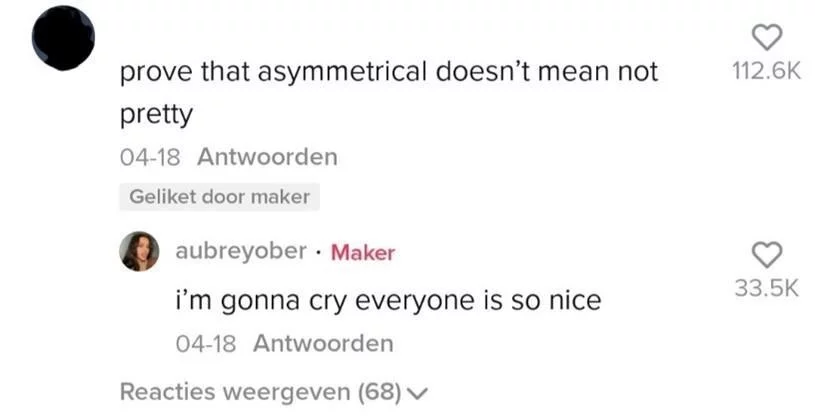 Aubrey liked the comment and responded. Her response suggests she is overwhelmed and surprised that everyone is nice to her. “I’m gonna cry” is a popular phrase of digital culture, used to express that someone is moved by something. Additionally, saying that “everyone is so nice” indicates that she got little to no hate comments. So, hardly anyone criticized her face and at least 112,6 thousand people agree that she is pretty despite her facial asymmetry. The video has constructed an online community of people sharing an identity, namely people agreeing that it is normal and common to have an asymmetrical face.