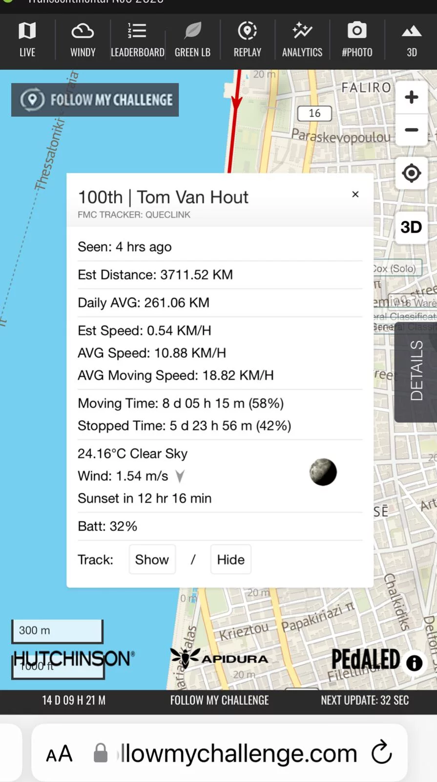 During the race, all riders were expected to self-quantify their movements and whereabouts using mandatory GPS trackers. The Follow My Challenge satellite trackers boast an accuracy of up to 2.5 metres (yikes), last four to six days on a single charge, and are designed to function in temperatures ranging from -20 to +55 degrees Celsius. These pocket-sized monitoring devices track rider progress and visualize their movements in the form of dots on a map (fig. 2) and numbers on screens (fig. 3), This in turn allows race organizers, riders and spectators to engage in dotwatching, a type of benign sousveillance (watching from below or social surveillance) that has come to define the datafied consumption of ultraracing.