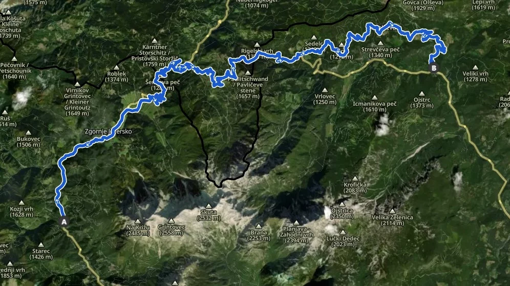 Speaking of machine vision, once riders were informed that their application had been successful, they were offered a three-month premium komoot membership. Komoot is a route-planning and navigation app with features such as multi-day tour planners, sport-specific maps and dynamic weather forecasts. These forms of machine vision allow riders to make informed routing decisions to navigate the various control points and parcours. Here's a satellite map of parcours 2, a mandatory 45km section across the Julian Alps in Slovenia and Austria. As soon as I approached the parcours, I relied on Komoot's voice navigation on my phone in addition to my GPS bike computer to follow the exact track and avoid time penalties.