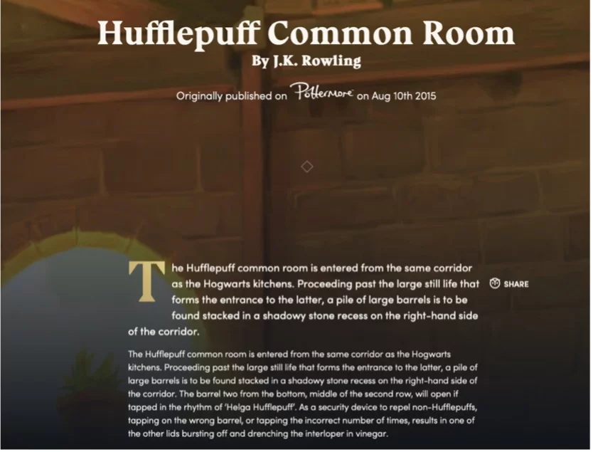 Rowling, J.K. (2015, August 10). Hufflepuff Common Room [Screenshot]. Wizarding World.