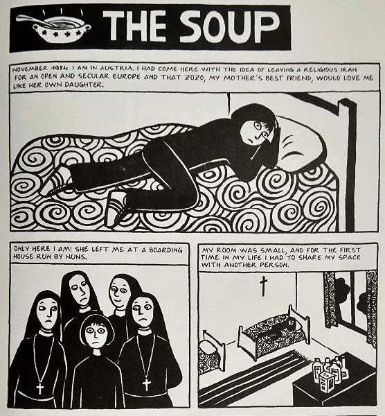 In the middle of this first part, the discourse presents an imminent secondary discursive beginning as Marji is sent off to Austria by her parents in an attempt to protect their independent and outspoken daughter. She ends up in a boarding school run by nuns in Vienna. The corresponding chapter ‘The Soup’ presents the opening of this new section, which is loaded as it incites an identity crisis in Marjane.