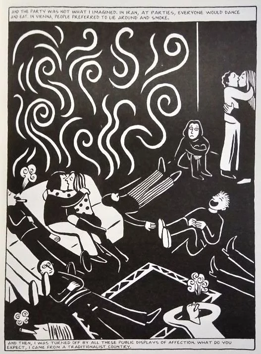 For Marjane, the longer she exists in the West, the more fragmented and alienated from herself, her surroundings, and her community she becomes. She struggles with the constrictions of her origins and cultural identity, for example when she attends a party and ends up alone in a corner while others get stoned and are sexually active. In this situation her feelings of discomfort and alienation are visualised as a full-page non-sequential dark image, with wild swirls of smoke and fear. Marjane is portrayed as an unhappy creature sitting in the far right corner (Satrapi, 2008).