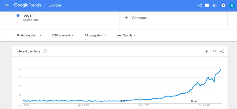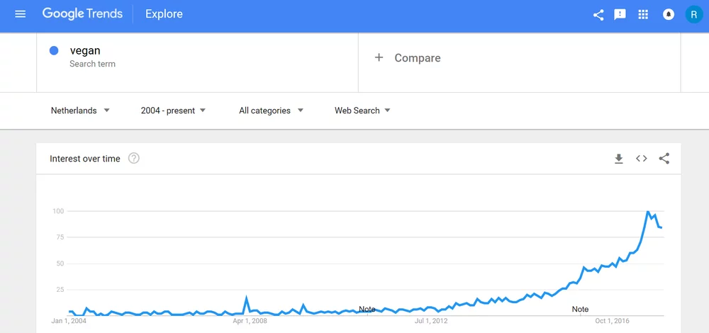 the growth ofvisible as well when we look at. Google trends is a site by Google that shows us the statistics of how much a certain topic has appeared in the queries in Google’s search engine in a certain amount of time, at a certain scale. We can put in per example the term “vegan”. Google Trends will show me a graphic with a blue line that indicates the “interest over time” in a certain timespan.By thisis meant.