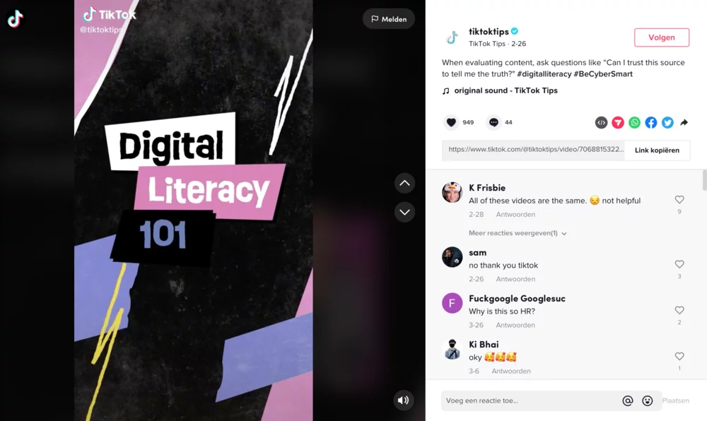 In 2020, TikTok and NAMLE already launched the “Be Informed” video series, in which TikTok influencers teached users to “Question the source” and “Question the graphics”, among other things. (TikTok, 2020). On 26 February 2022, two days after the Russian invasion of Ukraine, TikTok posted five new videos in a series titled “Digital Literacy 101”. In these video’s, users are (again) encouraged to be aware of the sources of the information they encounter and to analyze content in order to verify its reliability and truthfulness.