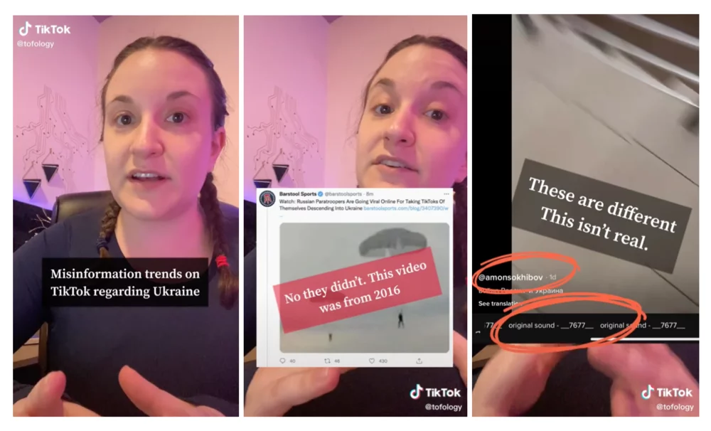 In one video, Richards points out misinformation trends on TikTok regarding Ukraine. She attempts to explain how misinformation is spread on TikTok by explaining the inner workings and dynamics of TikTok, like the (imagined) reasons the algorithm ‘pushes’ certain content. In this video, she also gives explicit media literacy advice to her watchers that aligns with the media literacy lessons TikTok shares in their own media literacy efforts, saying “make sure the audio is from the video that you’re watching” and “stay calm and stay skeptical” (@tofology, 2022). In her videos, Richards primarily makes use of the TikTok affordances that lets users display text, pictures and line drawings on top of their videos.