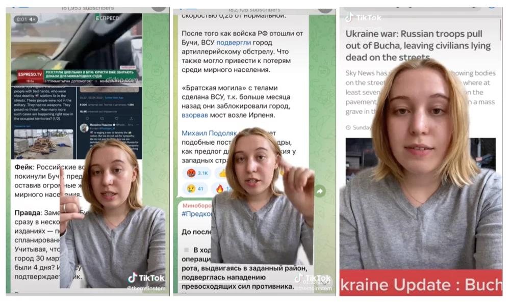 Regular users are non-verified users that use TikTok in a non-professional manner. They develop both general and TikTok-specific media literacy practices in a micro-level, covert, implicit manner, as described by Johnson (2013). An emblematic example of one such regular user is Ksen (@themsinstem), who has dedicated their TikTok account to translating Russian state media. In their TikTok videos, they make liberal use of the ‘green-screen’ functionality, which allows them to project screenshots of (Russian) media outlets behind them and point to certain points of interest, like discrepancies and lies in a Russian texts. In doing so, Ksen implicitly teaches her viewers how to spot a lie in Russian state media and how to discredit such lies by consulting independent news sources.
