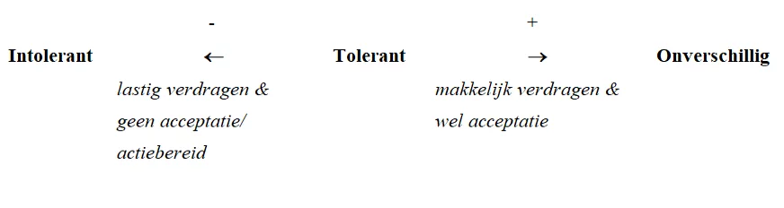 Hoe verder we op het continuüm tussen intolerant en onverschillig van tolerant naar intolerant gaan, hoe meer moeite we hebben met het accepteren en verdragen van een gebruik of opvatting. De andere kant op: hoe meer we van tolerant naar onverschillig bewegen, hoe makkelijker we verdragen en accepteren, tot op het punt dat het ons eigenlijk niks meer doet. Op het moment dat je een gebruik onacceptabel vindt, ben je bereid er een bepaalde mate van energie te steken in het veranderen of verbieden van dat gebruik en beweeg je richting intolerantie. Je bent nog wel verdraagzaam, maar ook actiebereid. Tot op het punt dat je de opvatting of het gebruik in het geheel niet meer kunt verdragen, dan ben je intolerant, iets dat we in een democratie zouden moeten willen bestrijden.