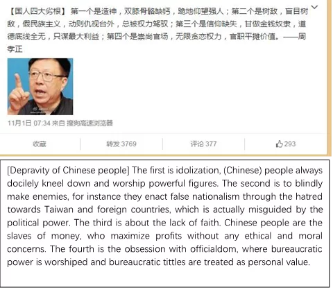 This social criticism can be dated back to the early 20th Century and it marked the high point of Chinese intellectuals’ public intervention to solve the national crisis of that period. The following post is from a famous political microblogger called Baigu Lunjin on Weibo (Figure 1). It showcases the content of national characters criticism