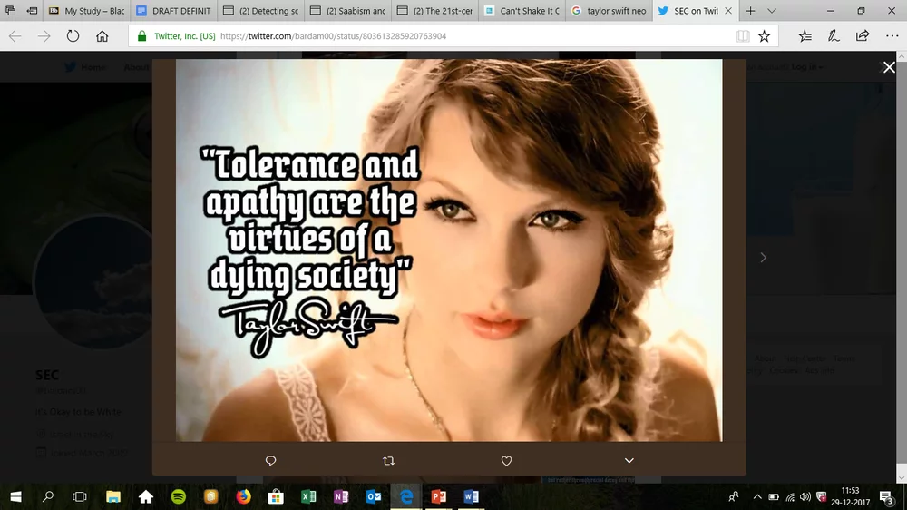 Some believe it all started with some memes on Pinterest back in 2013, where pictures of Swift were combined with some Hitler quotes. Just a fun parody, but this quickly escalated to much more. It is not just a funny joke anymore, it became a real thing in which manyneo-Nazi’sbelievethatSwiftembodiestheAryanspiritunlikemanyotherartistswithNordicbloodlikeMileyCyrus. she embodies, purity, femininity and innocence (Sunderland, 2016). The singer just has many qualities that the alt-right endorse and want the entire society to have. And both of the groups have their foundations online. ‘’Taylor Swift is a pure Aryan goddess, like something out of classical Greek poetry. Athena reborn. That’s the most important thing,” says Andre Anglin, the writer of the white supremacist blog the Daily Stormer’’ (Dodsen, 2017).