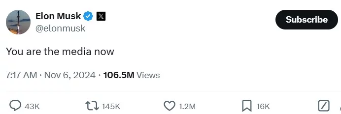 Musk, E. [@elonmusk]. (2024a, November 6). You are the media now [Post]. X. https://x.com/elonmusk/status/1854045379408326909?lang=en